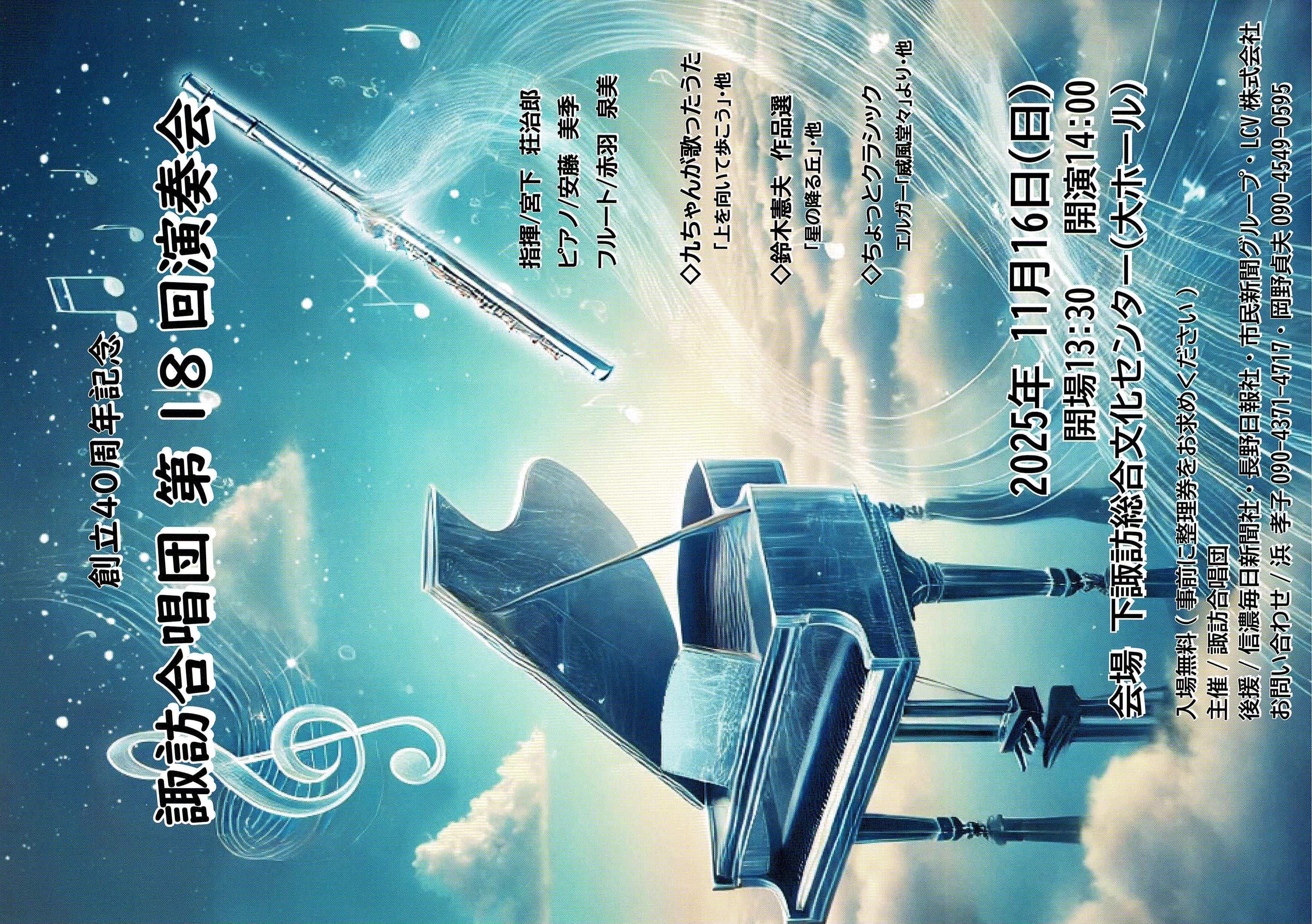 SCHEDULE 下諏訪総合文化センター・大ホール (信州・下諏訪町)創立40周年記念諏訪合唱団 第18回演奏会 ■日時 11月16日(日) 開場 13:30 / 開演 14:00 ■入場無料(事前に整理券をお求めください) ■合唱 諏訪合唱団 指揮 宮下荘治郎 ピアノ 安藤美季 フルート 赤羽泉美 ■会場 《下諏訪総合文化センター・大ホール》 ■主催 諏訪合唱団 ■後援 信濃毎日新聞社、長野日報社、市民新聞グループ、LCV株式会社 ■お問合せ 090-4371-4717(浜)、090-4549-0595(岡野)